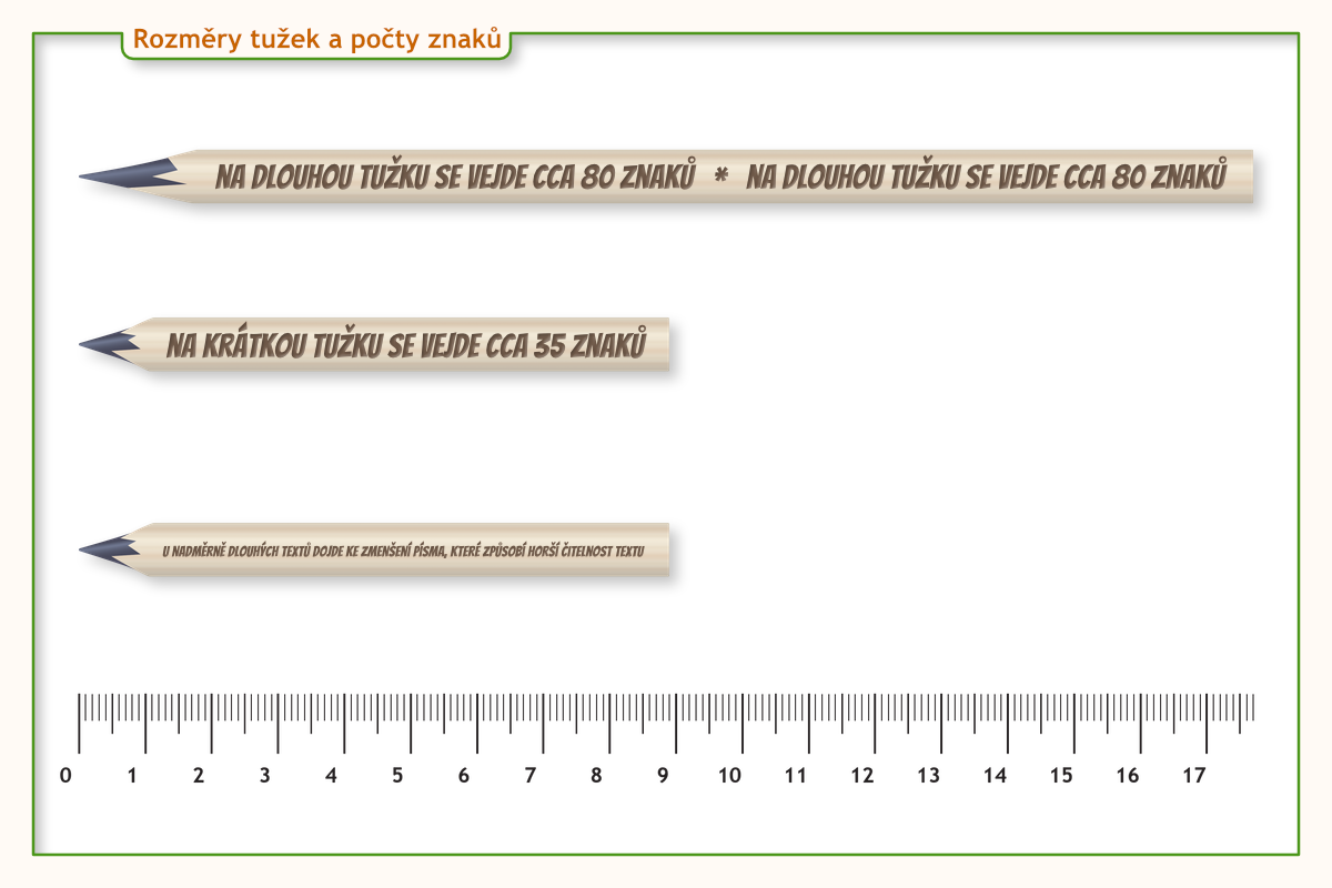Pro malou tužku doporučujeme maximálně 25 znaků, pro klasickou 50 znaků na jednu hranu (při více znacích je zmenšována velikost písma).